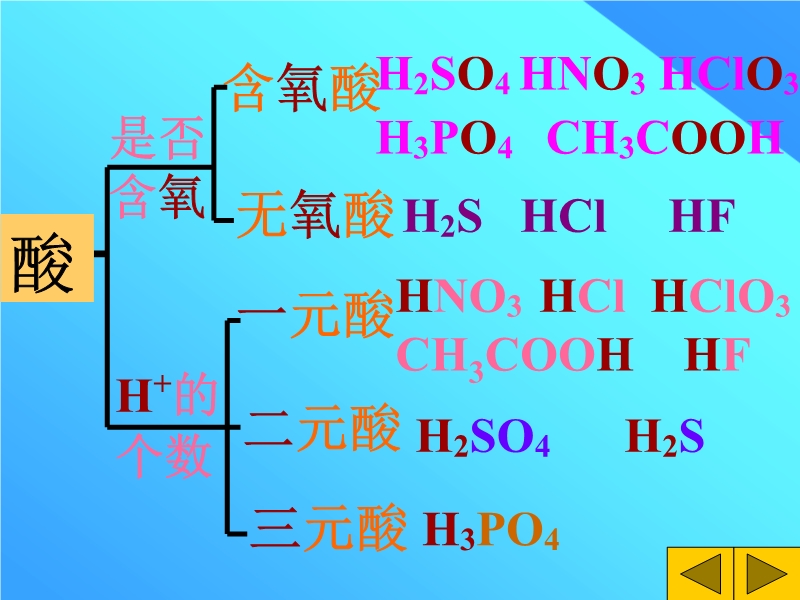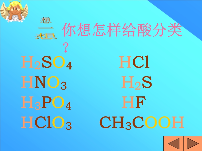 【内容简介】本课件以粤教版为基础制作,共有36张幻灯片组成,以精美的图片和实验为主。讲解了怎样给酸分类、读出这些酸的名称、酸的通性、并让学生分组实验。用练习巩固