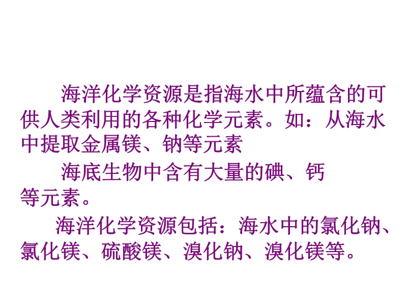 【内容简介】本课件以粤教版为基础制作,共有13张幻灯片组成,以文字为主.讲解了海水晒盐、海水制镁、海水淡化的方法,以及海洋的污染。