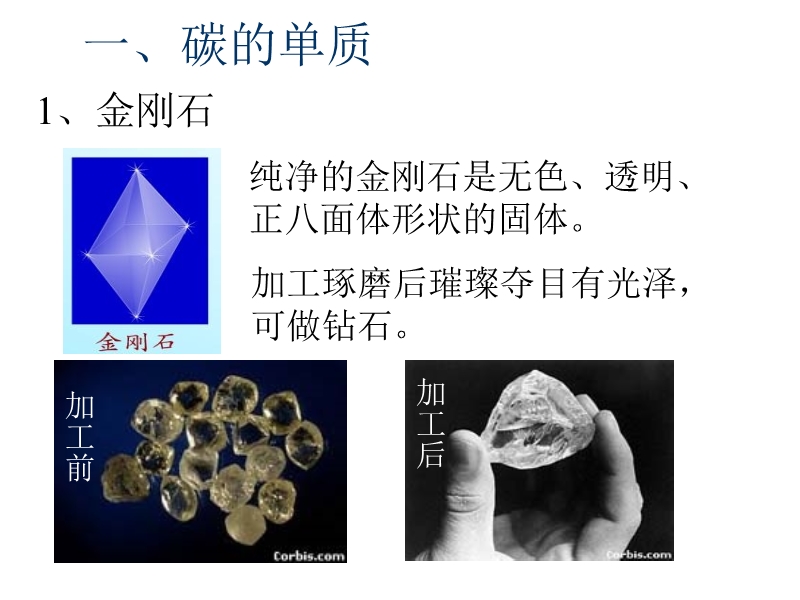 【内容简介】2本课件以人教版为基础制作,共有38张幻灯片组成。引导学生探究同一种元素能不能组成不同的单质。介绍了金刚石、石墨、C60结构、金刚石和石