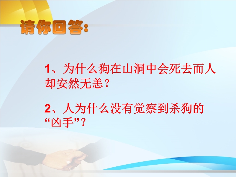 【内容简介】本课件以人教版为基础制作,共有22张幻灯片组成.主要是人教版第六单元《课题3 二氧化碳和一氧化碳》第一课时。以故事死狗洞引导学生探究