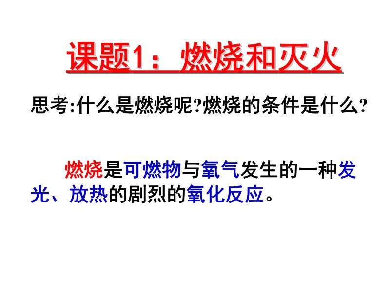 【内容简介】本课件以人教版为基础制作,共有23张幻灯片组成,以问题什么是燃烧呢?燃烧的条件是什么?引导学生探究可燃物燃烧条件、灭火的原理和方法,常用灭火器及其使用、习题演练等。教师上课可根据需要修改