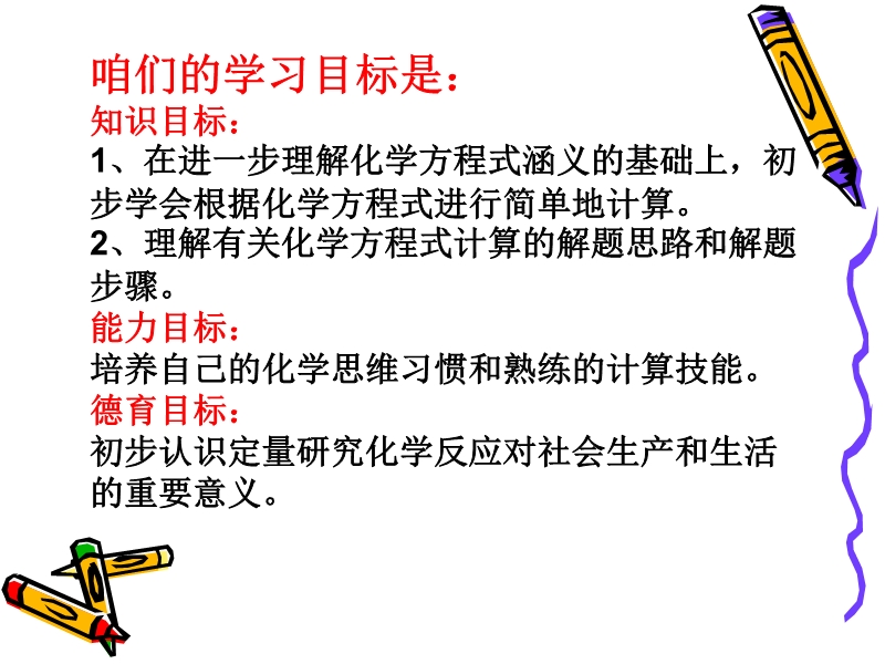 【内容简介】本课件以鲁教版为基础制作,共有12张幻灯片组成。内容学习目标、归纳了在化学反应中各物质的质量关系、根据化学方程式的计算依据、演示了解题过程。并加以练习。文件可以根据需要修改。