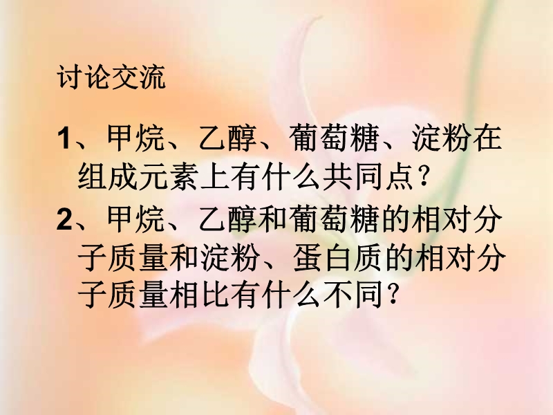 1、甲烷、乙醇、葡萄糖、淀粉在组成元素上有什么共同点?2、甲烷、乙醇和葡萄糖的相对分子质量和淀粉、蛋白质的相对分子质量相比有什么不同?介绍有机化合物的一般性质,然后了解生活 仔细观察你身边的材料(羊毛线、棉花、一次性水杯、、电线开关、垃圾袋、汽车轮胎),你知道这些制品是用什么做成的吗?都是天然的吗?活动探究玻璃。介绍有机合成材料之二——合成纤维,谈谈你的高见:1)使用塑料好处多还是坏处多?2)如何解决“白色污染”问题?