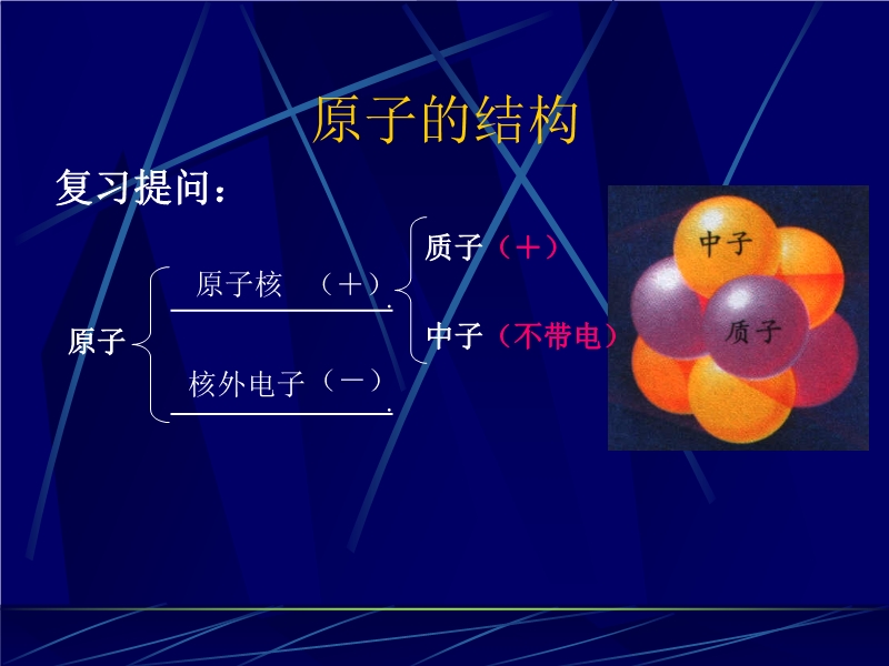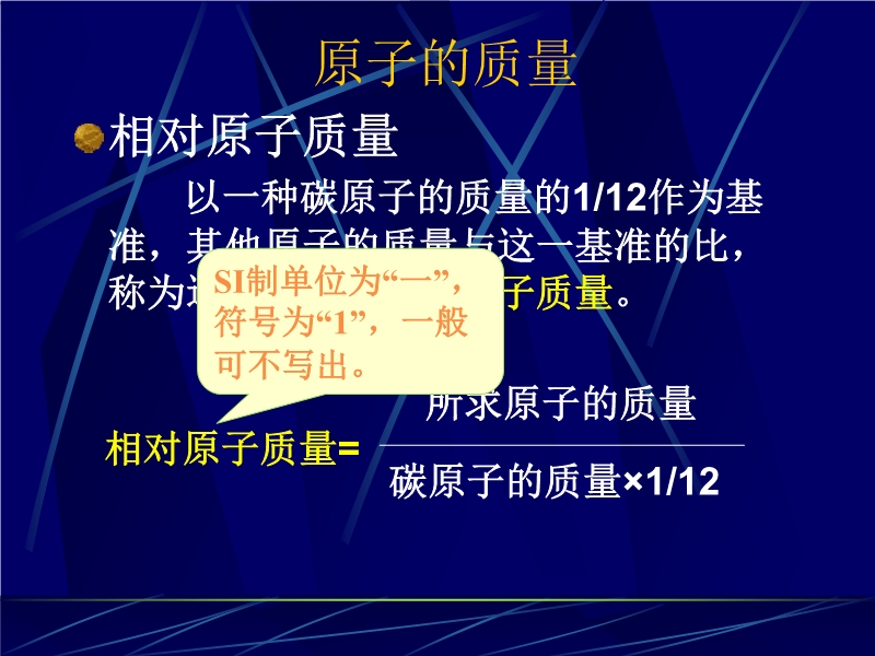 【内容简介】本课件以沪教版为基础制作,共有11张幻灯片组成,包括原子的结构复习、相对原子质量计算、认识离 子、分子、原子、离子间的转化关系。拓展练习