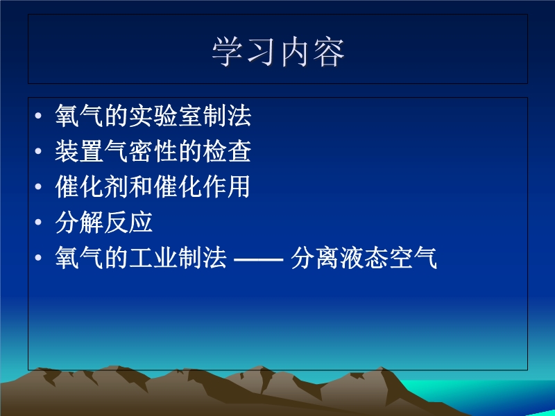 【内容简介】本课件以粤教版为基础制作,共有43张幻灯片组成,资料详尽,图片精美。探究了氧气的实验室制法、装置气密性的检查 、催化剂和催化作用 、分解反应 、氧气的工业制法 等