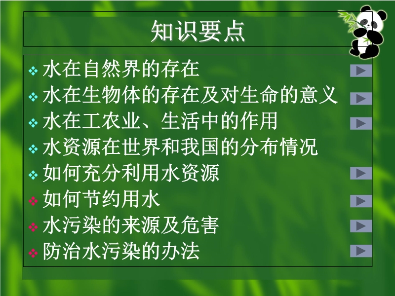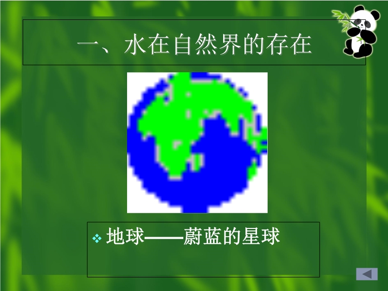 【内容简介】本课件以粤教版为基础制作,共有10张幻灯片组成,介绍了水在自然界的存在、水在生物体内的存在及对生命的意义、水在工农业、生活中的作用、水污染的来源和危害、防治水污染的方法等