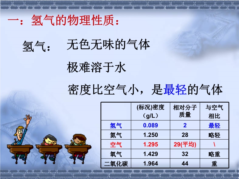 【内容简介】本课件以粤教版为基础制作,共有24张幻灯片和三个flash文件组成组成,图片精美,探究了氢气的物理性质,化学性质以及它的广泛用途。