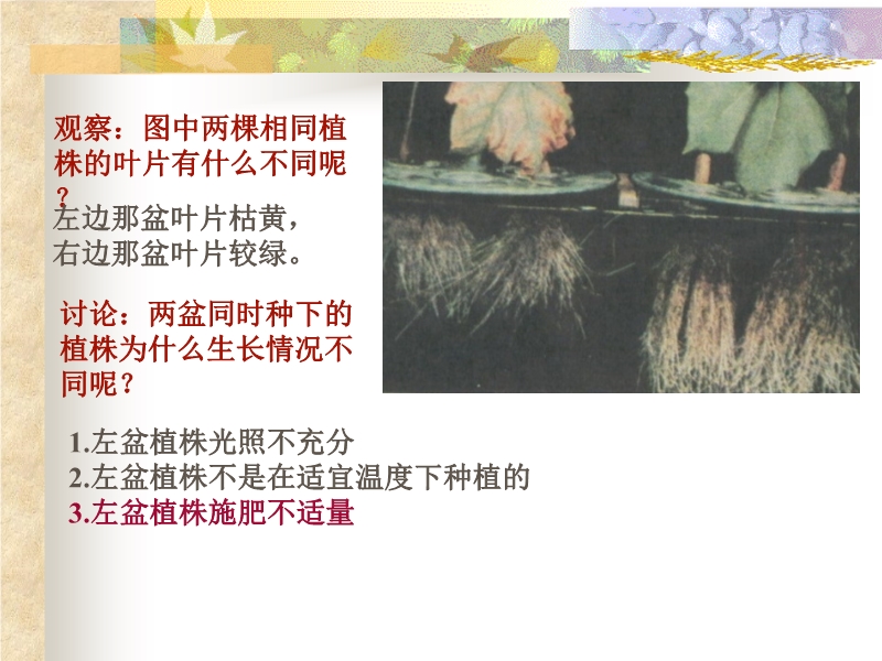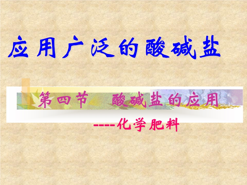 【内容简介】本课件以沪教版为基础制作,共有10张幻灯片组成,内容是第七章第四节酸碱盐的应用,从观察2张植物图片不同,探究化学肥料分类,化肥与植物的生长,化肥与农家肥的比较,化肥的检验,化肥的使用等。