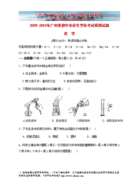2010年广州市中考模拟考试化学试题及答案