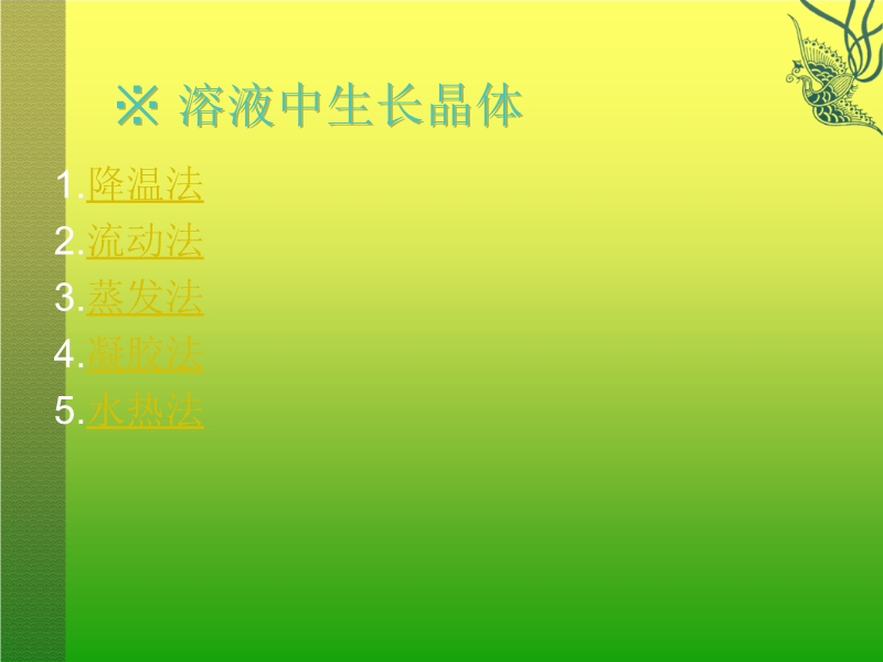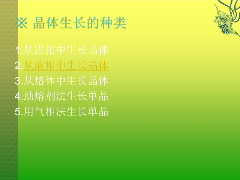 【内容简介】本课件以粤教版为基础制作,共有11张幻灯片组成,以文字为主,内容是主要是介绍晶体在液体中的生长的种类,有部分图示,教师可以直接修改,使用方便。