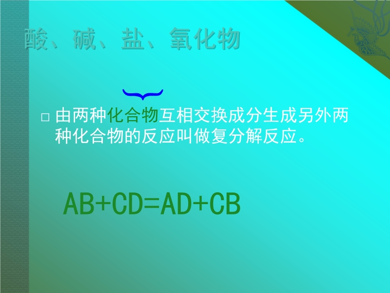 【内容简介】本课件以粤教版为基础制作,共有17张幻灯片组成,主要内容是关于复分解反应的条件,有复分解反应的定义,种类等,实验探究了复分解反应的条件并练习巩固