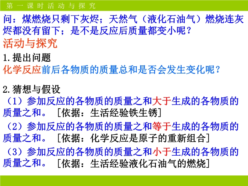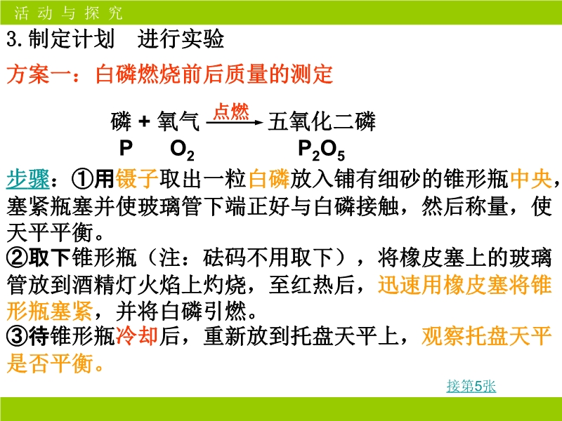 【内容简介】本课件以人教版为基础制作,共有18张幻灯片组成,分2课时完成,主要是利用实验探究质量守恒定律。