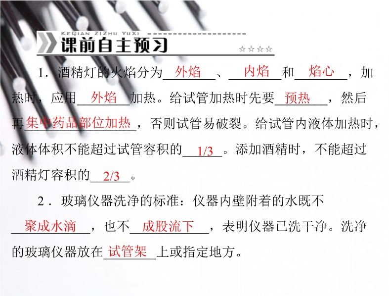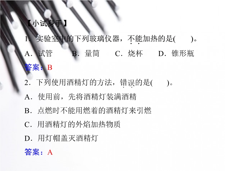 2012新人教版初中化学《 第一单元 课题3走进化学实验室 第2课时 物质的加热 仪器的洗涤》随堂优化训练(PPt课件)