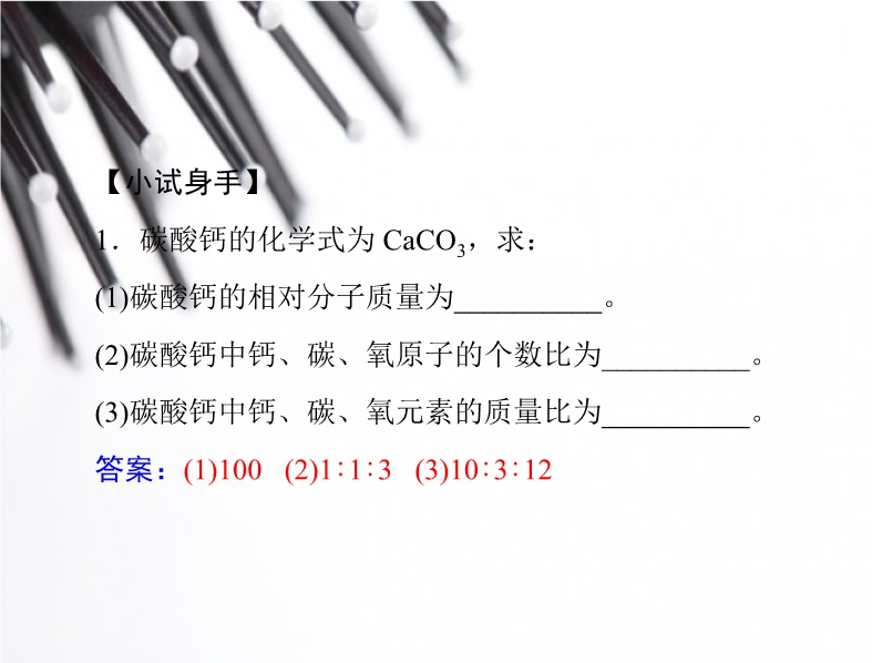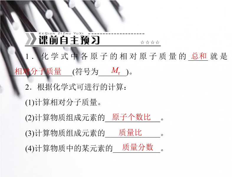 【内容简介】本课件以2012新人教版教材第四单元课题4化学式与化合价第二课时有关相对分子质量的计算为基础制作,共有15张幻灯片组成,是随堂练习的配套课件
