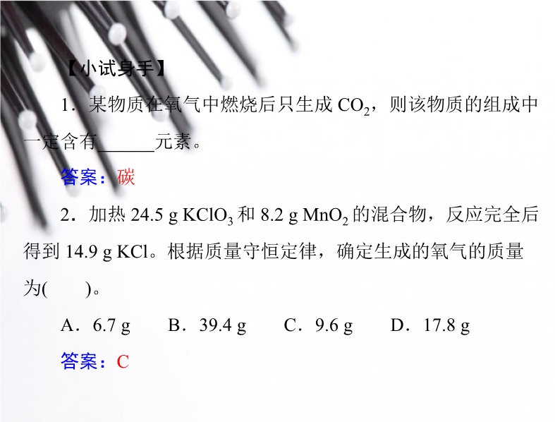 【内容简介】本课件以2012新人教版教材第五单元课题1质量守恒定律为基础制作,共有11张幻灯片组成,是随堂练习的配套课件