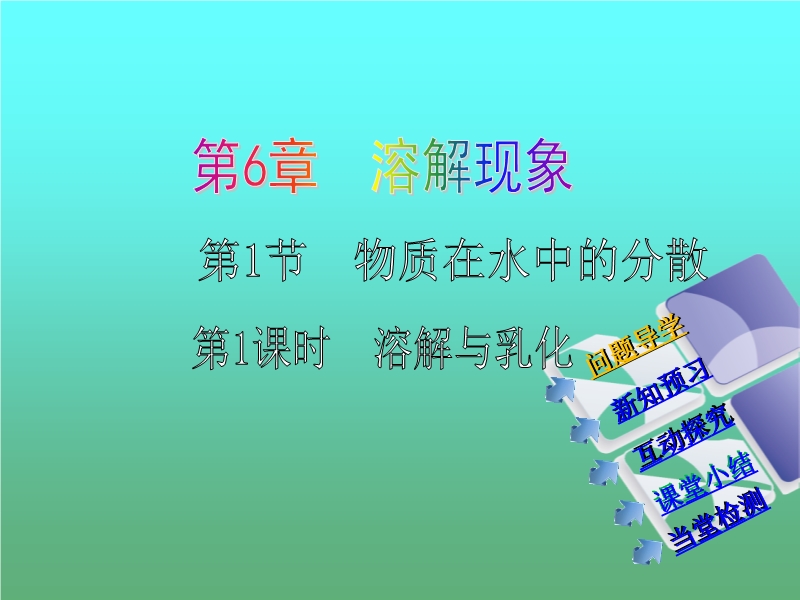 【内容简介】本课件以2013新沪教版教材第六章溶解现象第一节物质在水中的分散第一课时溶解与乳化为基础制作,共有28张幻灯片组成,有问题导学、新知预习、互动探究、课堂小结和当堂检测等部分。条理清楚,知识点总结到位,是教师上课的好资料。