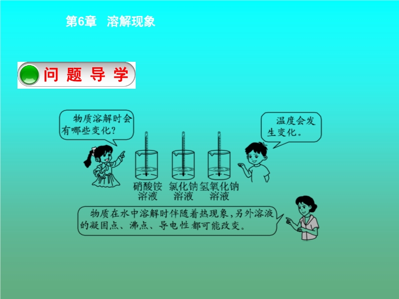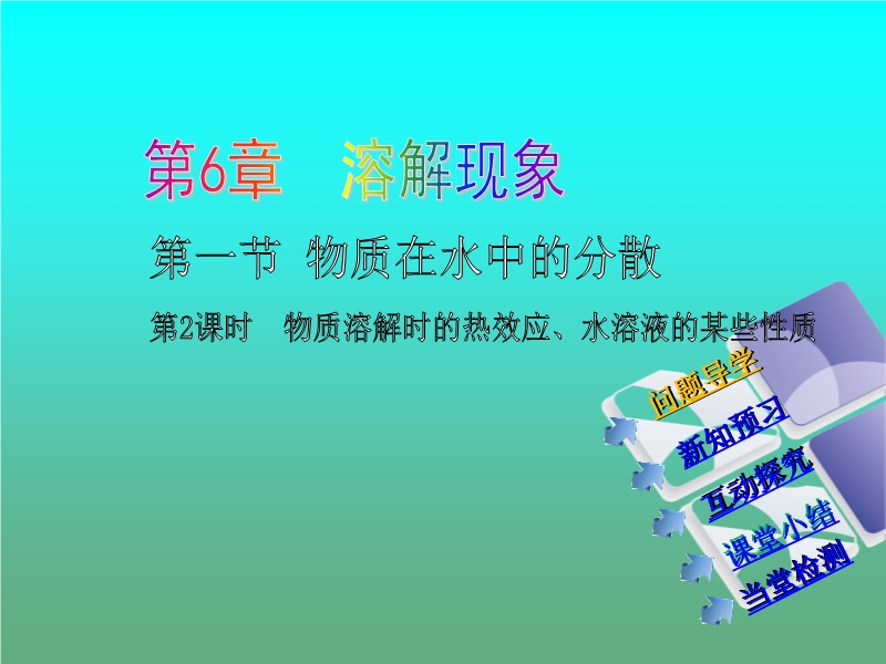 本课件以2013新沪教版教材第六章溶解现象第一节物质在水中的分散第二课时物质溶解时的热效应、水溶液的某些性质为基础制作,共有22张幻灯片组成,有问题导学、新知预习、互动探究、课堂小结和当堂检测等部分。条理清楚,知识点总结到位,是教师上课的好资料。
