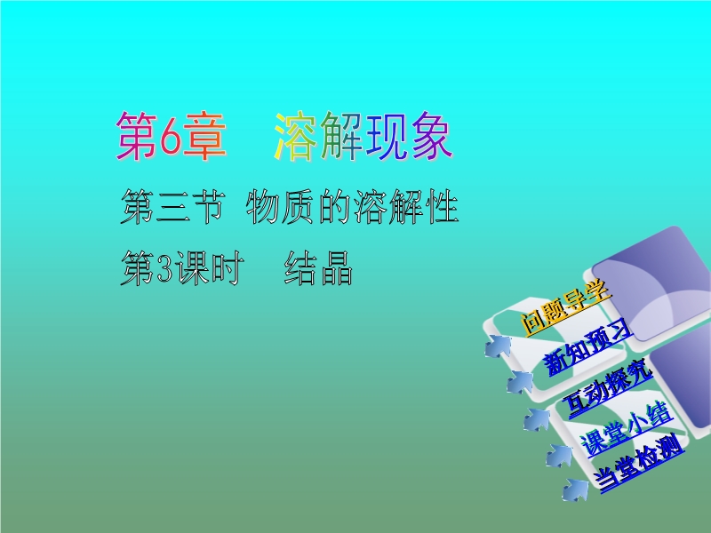 【内容简介】本课件以2013新沪教版教材第六章溶解现象第三节物质的溶解性第三课时结晶为基础制作,共有23张幻灯片组成,有问题导学、新知预习、互动探究、课堂小结和当堂检测等部分。条理清楚,知识点总结到位,是教师上课的好资料。