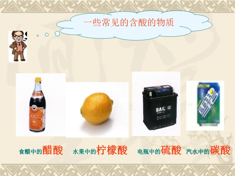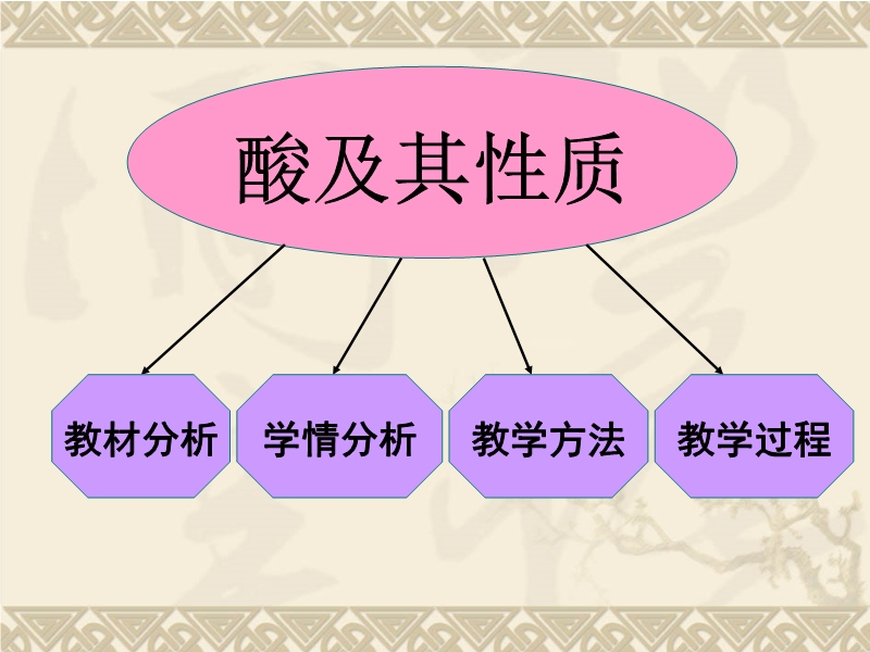 【内容简介】本课件以新鲁教版教材第七单元常见的酸和碱第一节酸及其性质为基础制作,共有39张幻灯片组成,课件出示一些常见的含酸的物质,然后按说课的程序教材分析、学情分析、教学方法、教学过程