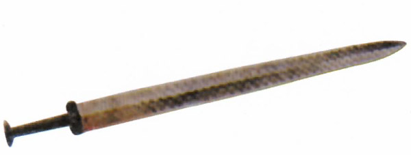 越王勾践青铜剑 举世闻名的越王勾践青铜剑,1965年12月出土于湖北省江陵望山的一号楚国贵族墓(距春秋时代楚国别都纪南城故址七公里)。考古工作者在墓主人身体的左手边,发现一柄装在黑色漆木箱鞘内的名贵青铜剑。青铜剑与剑鞘吻合得十分紧密。拔剑出鞘,寒光耀目,而且毫无锈蚀,刃薄锋利。试之以纸,20余层一划而破。剑全长为55.6厘米,其中剑身长45.6厘米,剑格宽5厘米。剑身满饰黑色菱形几何暗花纹,剑格正面和反面还分别用蓝色琉璃和绿松石镶嵌成美丽的纹饰,剑柄以丝绳缠缚,剑首向外形翻卷作圆箍,内铸有极其精细的11道同心圆圈。