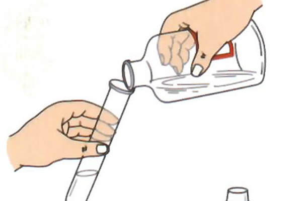 3.拿细口瓶倒液时,贴标签的一面要朝向手心处;