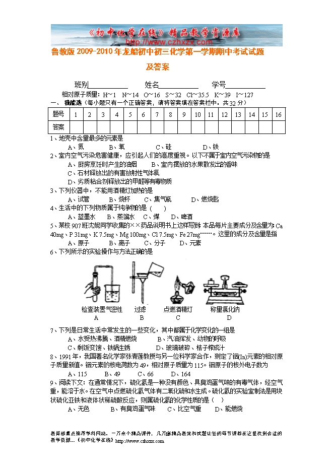鲁教版2009-2010年龙船初中初三化学第一学期期中考试试题及答案