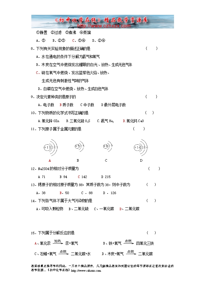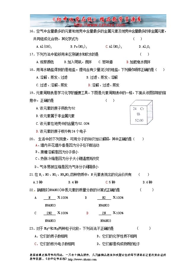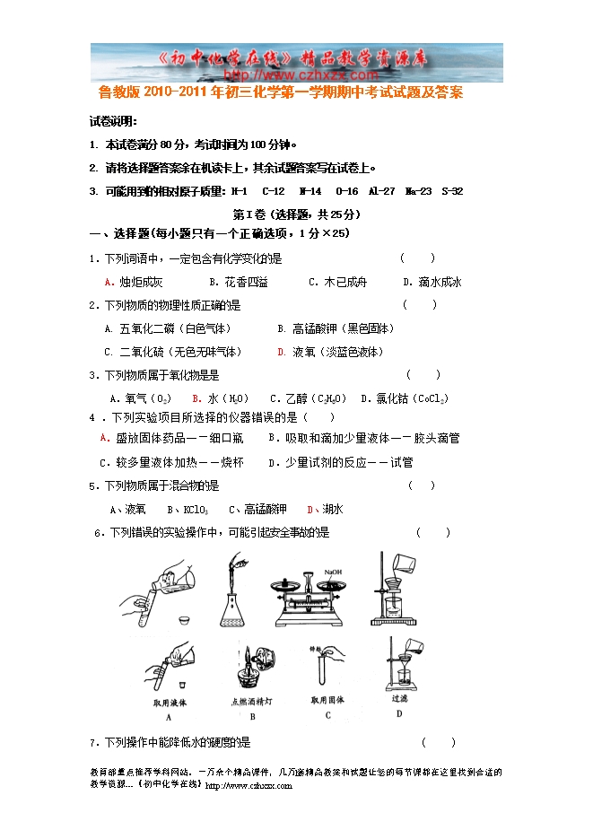 鲁教版2010-2011年初三化学第一学期期中考试试题及答案