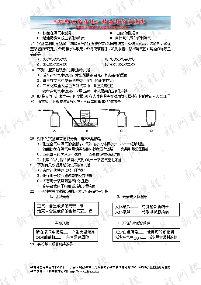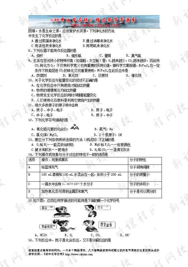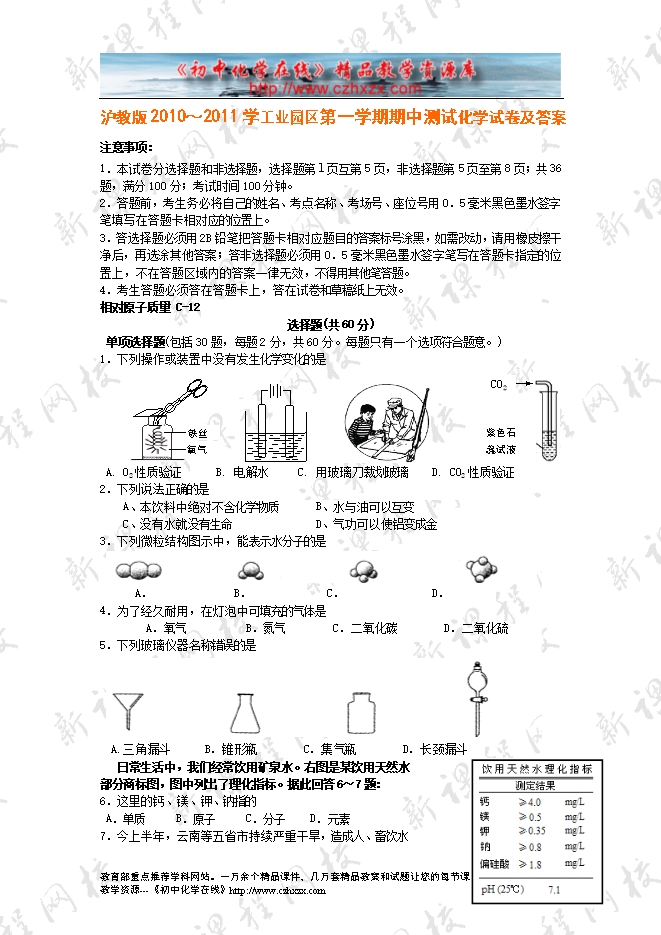 沪教版2010~2011学年第一学期期中测试化学试卷及答案