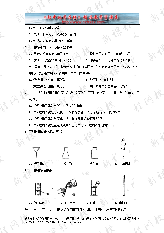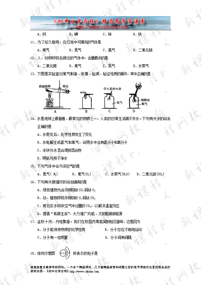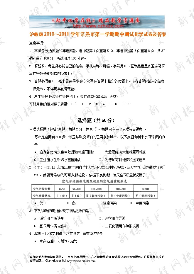 沪教版2010~2011学年常熟市第一学期期中测试化学试卷及答案