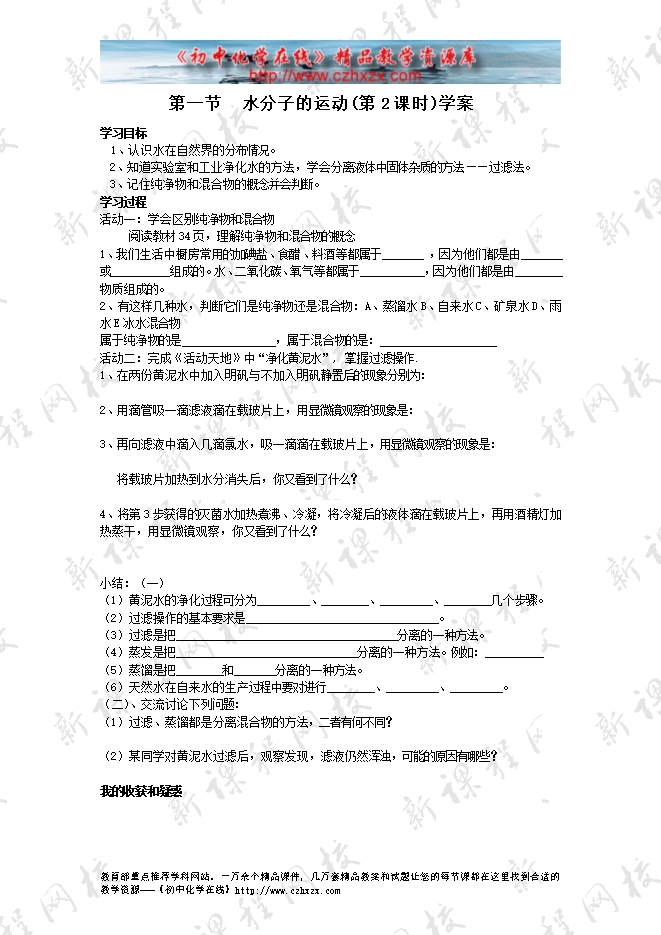 - 上一份资料:鲁教版第二章《第一节 运动的水分子》学案(第一课时)