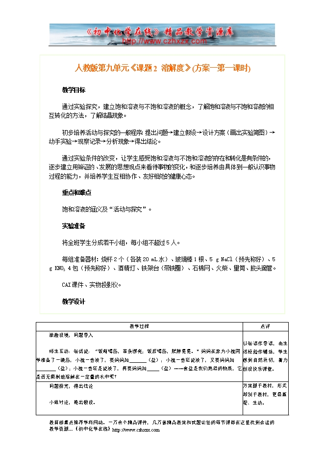 - 下一份资料:人教版《第九单元课题2 溶解度》教案(方案一第二课时)