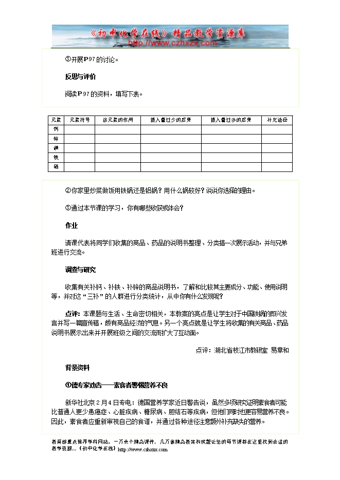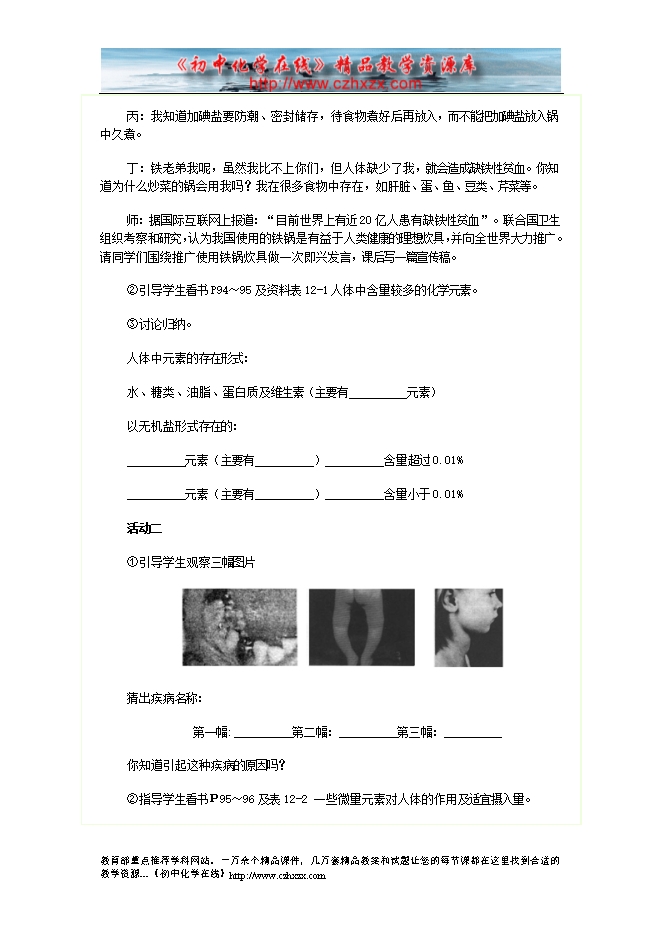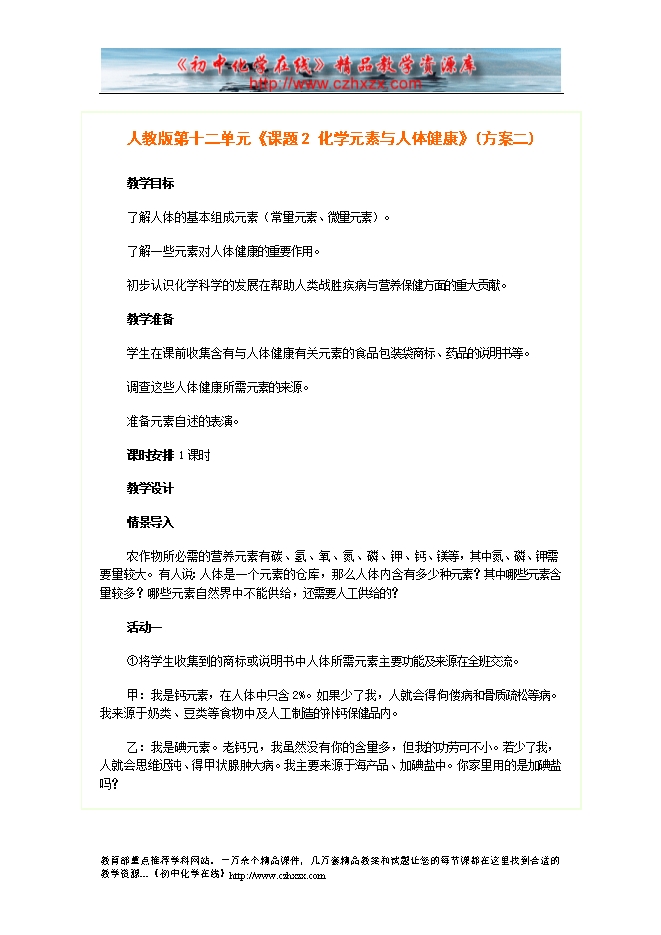 人教版第十二单元《课题2 化学元素与人体健康》教案(方案二)