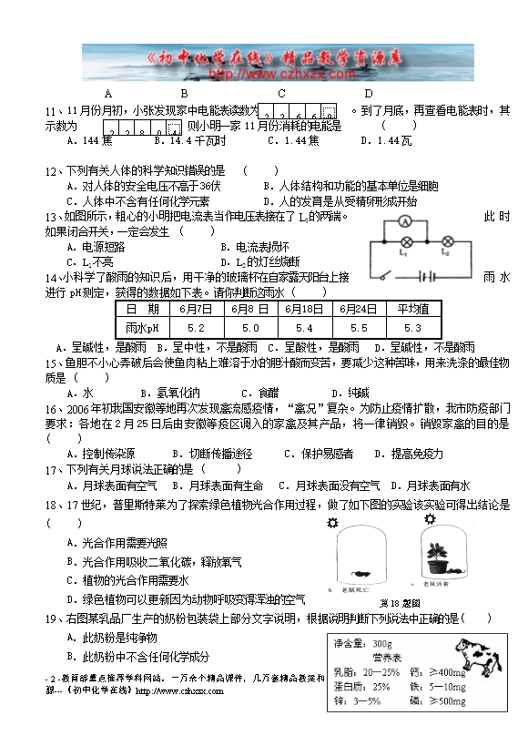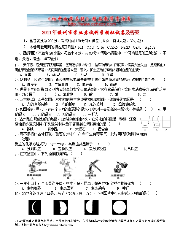 2011年浙江省温州市学业考试科学模拟试卷及答案