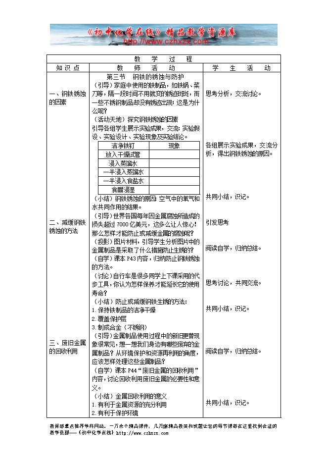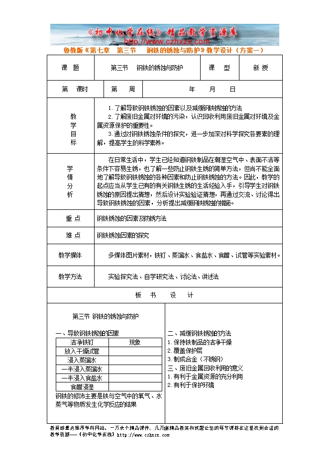 鲁教版《第九章第三节 钢铁的锈蚀与防护》教学设计(方案一)