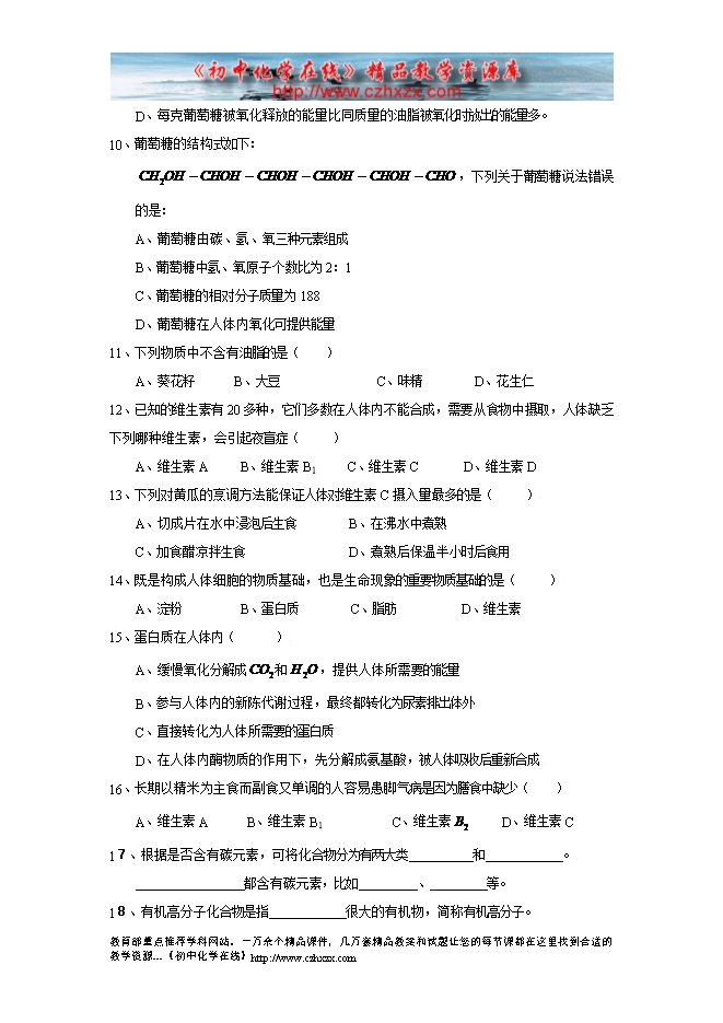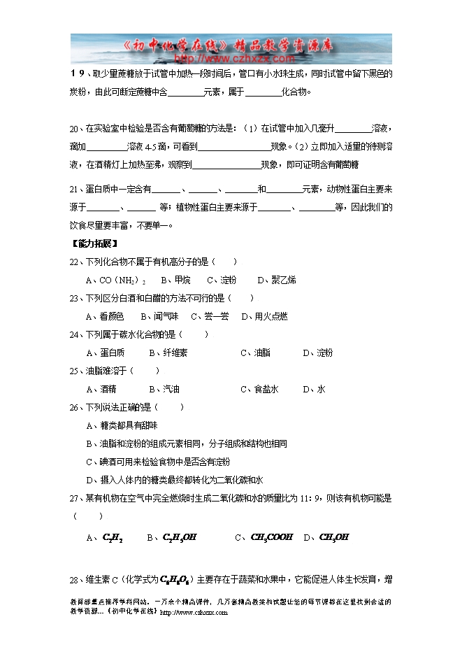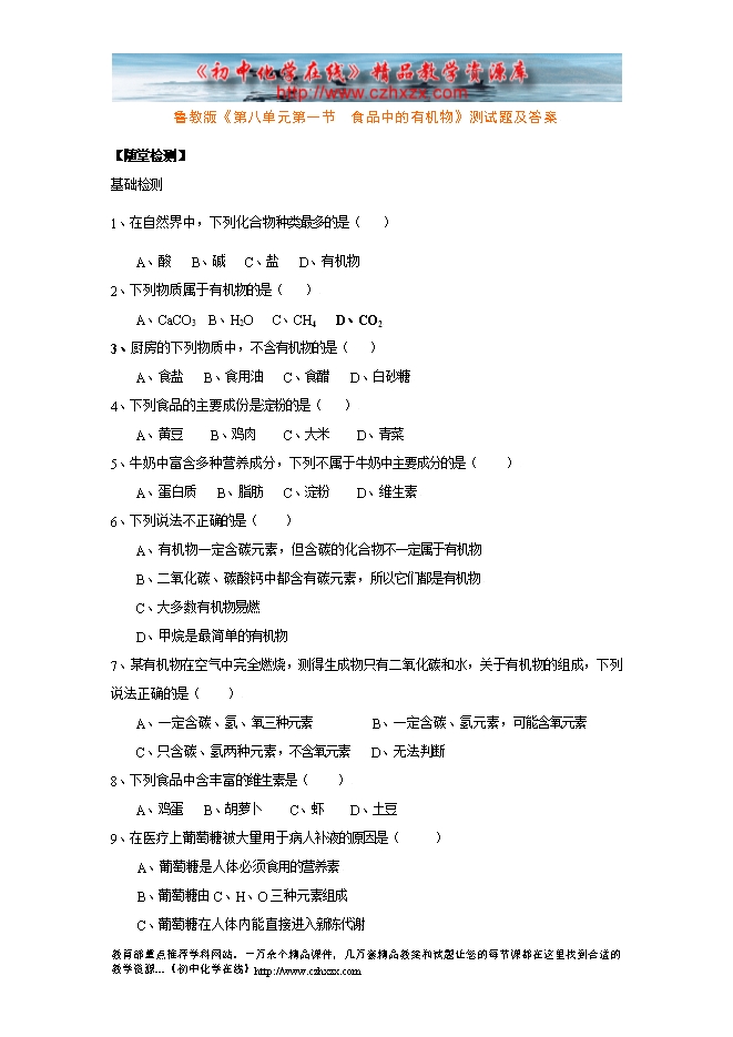 鲁教版《第十单元第一节 食物中的有机物》测试题及答案