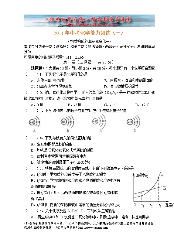 - 下一份试卷:2011年中考化学能力训练及答案(二)