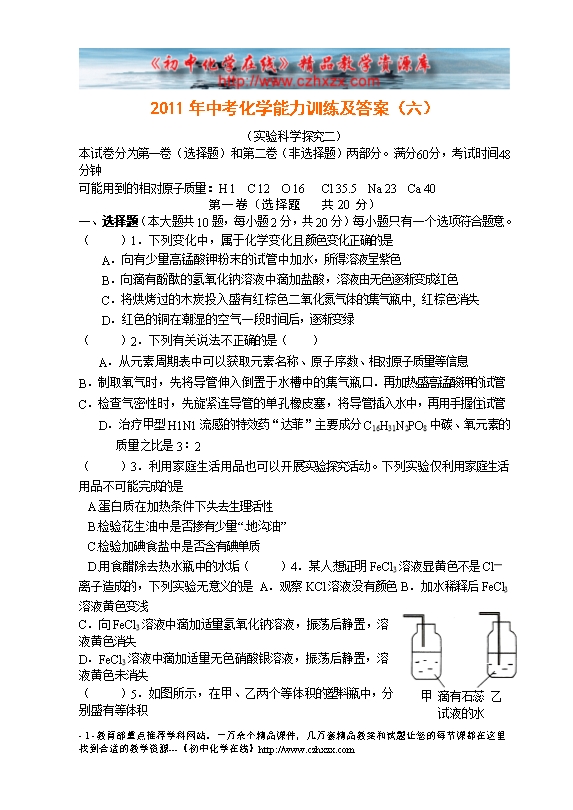 - 上一份试卷:2011年中考化学能力训练及答案(五)
