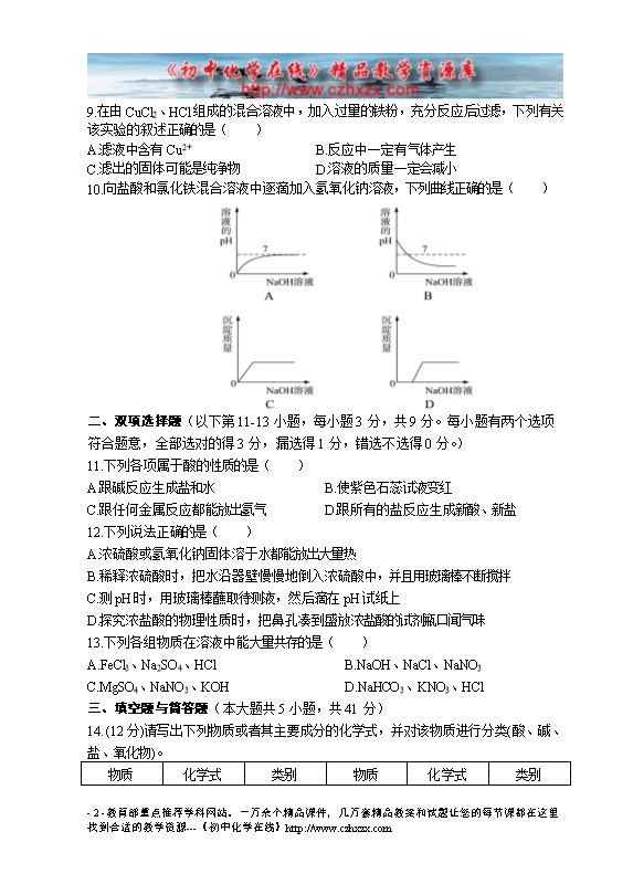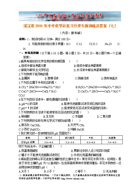 湛江市2011年中考化学总复习分类专题训练及答案(七)