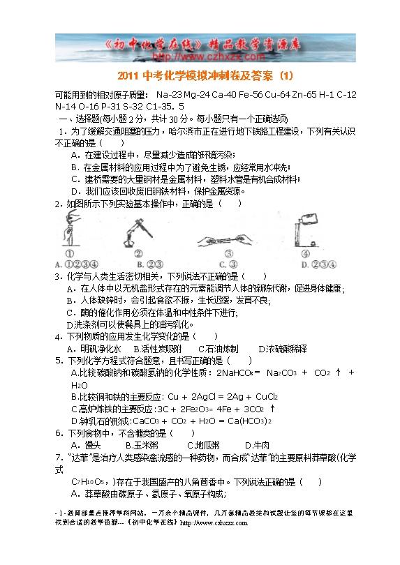- 下一份试卷:2011中考化学模拟冲刺卷及答案 (2)