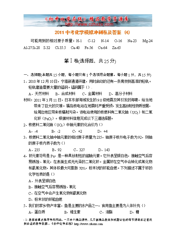 - 下一份试卷:2011中考化学模拟冲刺卷及答案 (5)