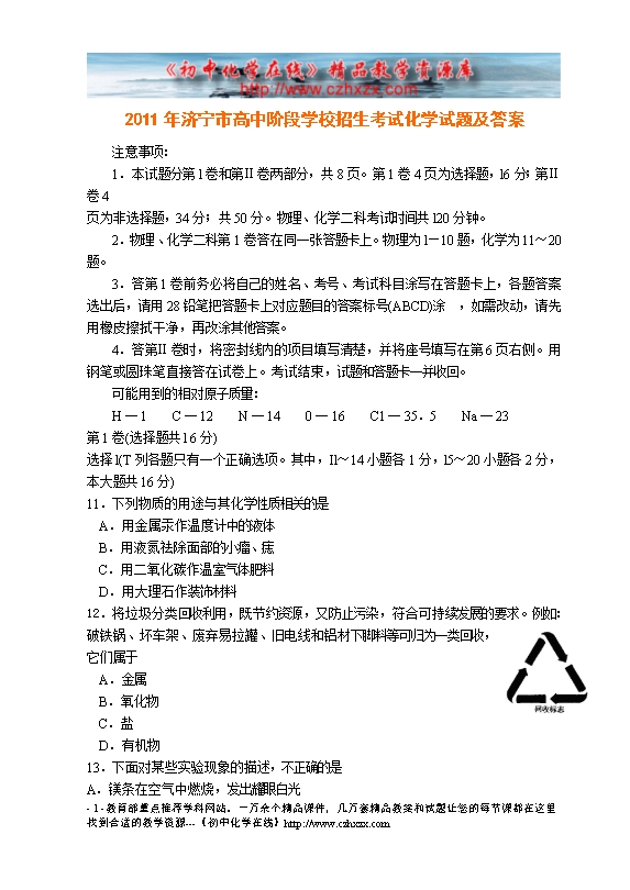 2011年山东省济宁市高中阶段学校招生考试化学试题及答案