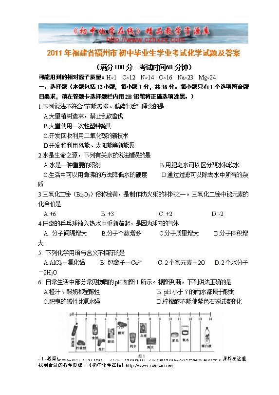2011年福建省福州市初中毕业生学业考试化学试题及答案