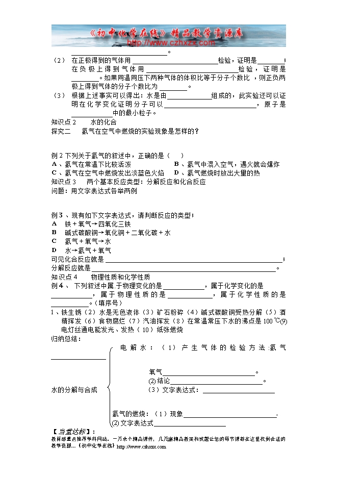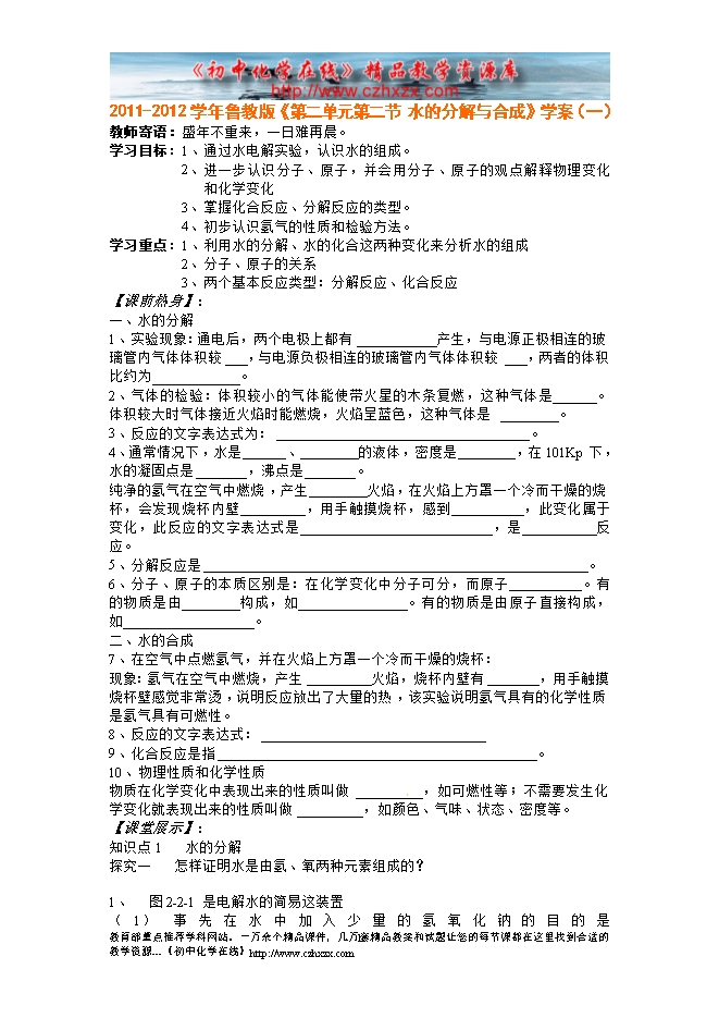 2011-2012学年鲁教版《第二章第二节 水分子的变化》学案(一)