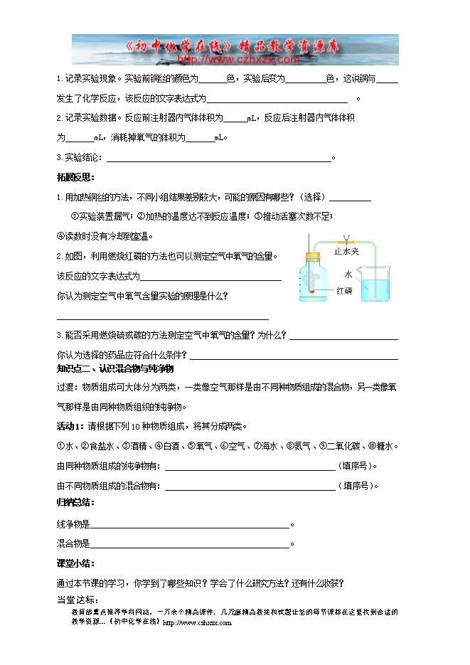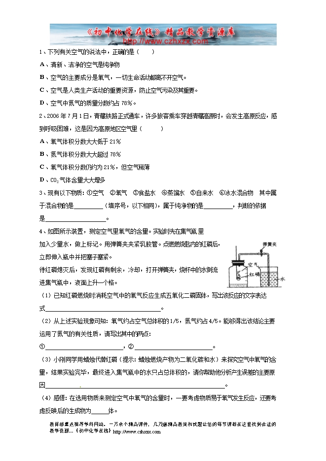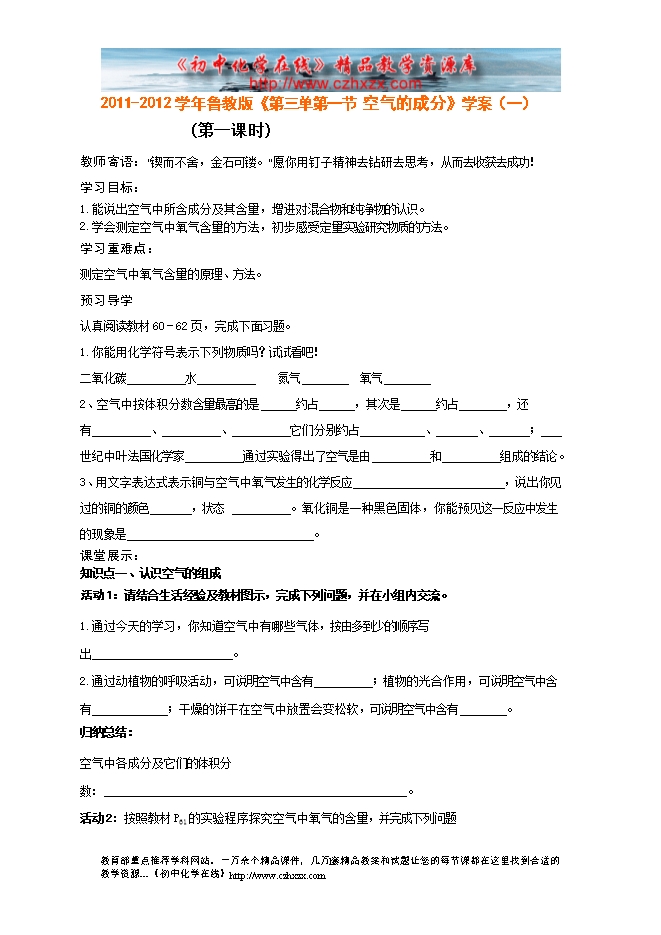 2011-2012学年鲁教版《第四章第一节 空气的成分》学案(一)