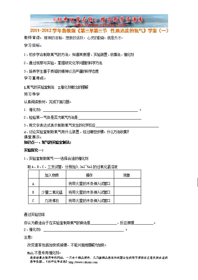 2011-2012学年鲁教版《第四章第三节 氧气》学案(一)