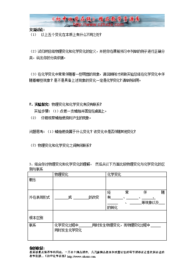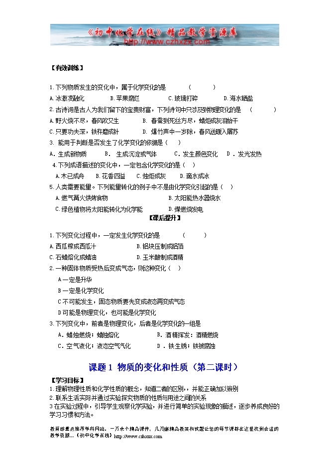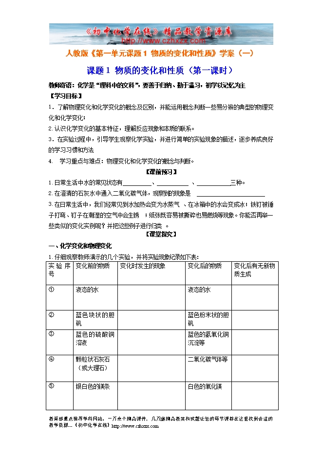 人教版《第一单元课题1 物质的变化和性质》学案(一)