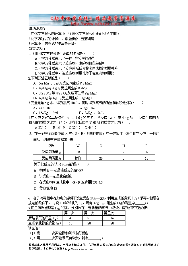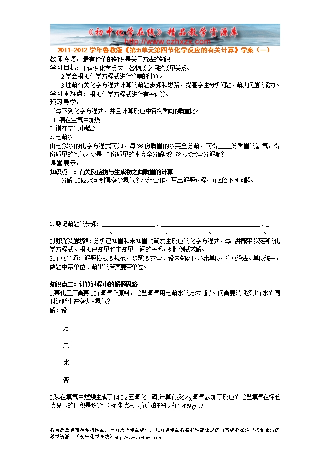 2011-2012学年鲁教版《第五章第三节 化学反应中的有关计算》学案(一)