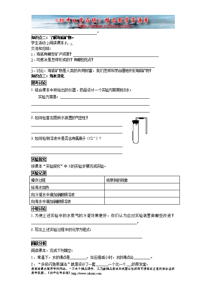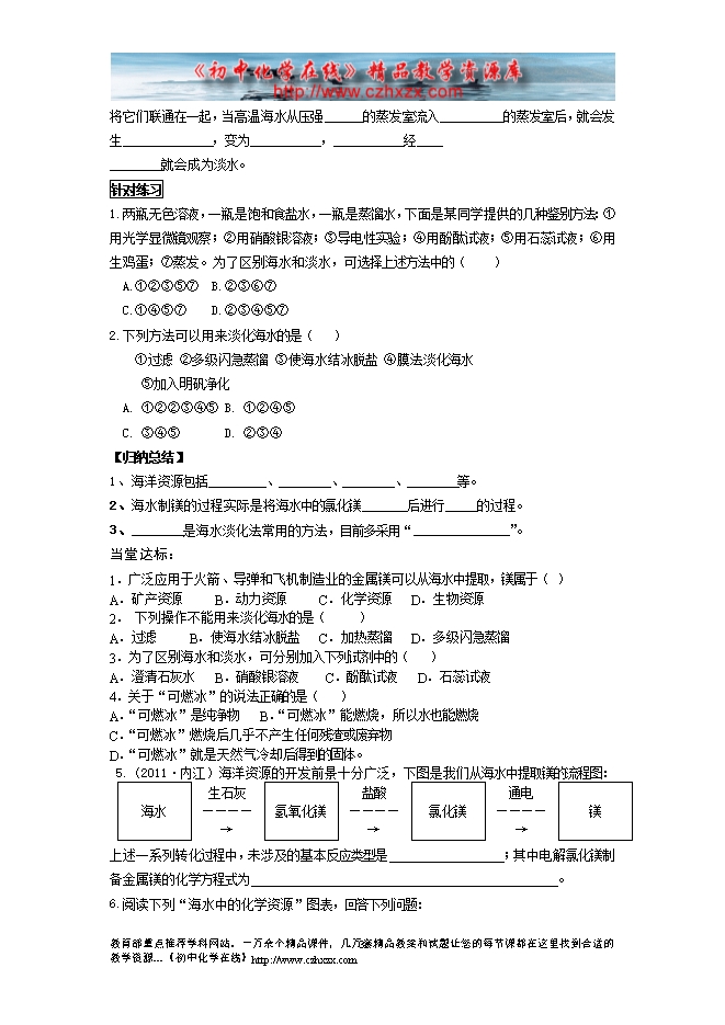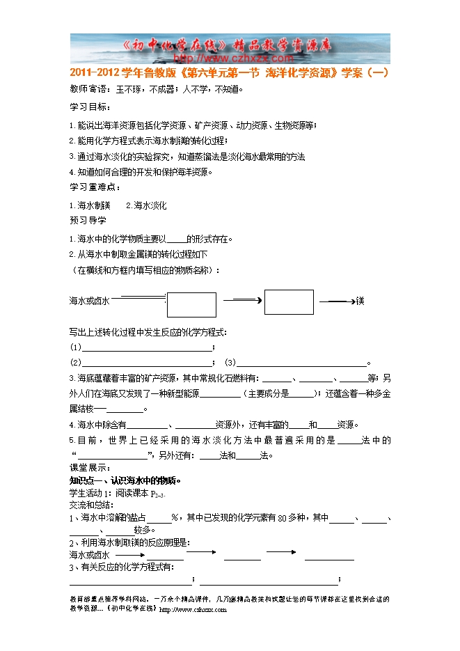 2011-2012学年鲁教版《第八章第一节 海洋化学资源》学案(一)
