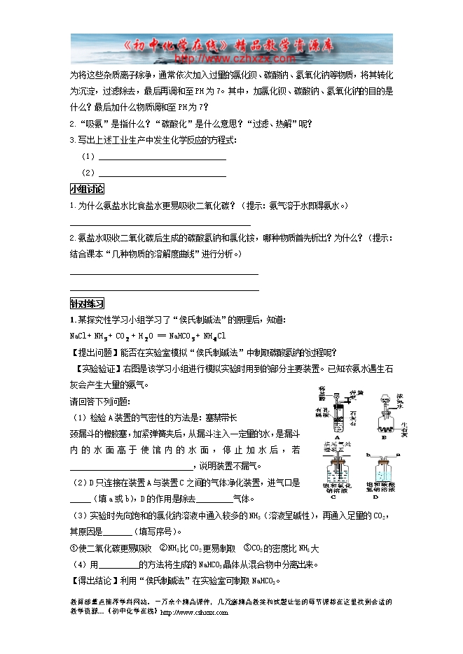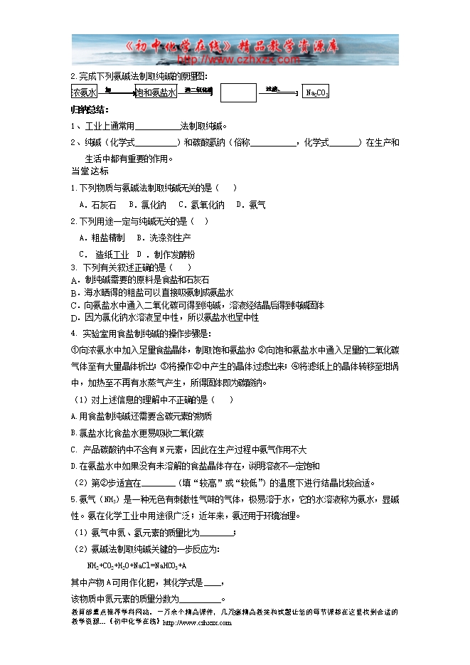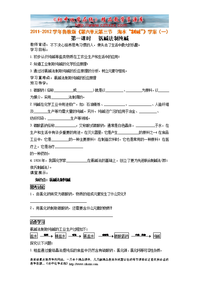 2011-2012学年鲁教版《第八章第三节 海水“制碱”》学案(一)