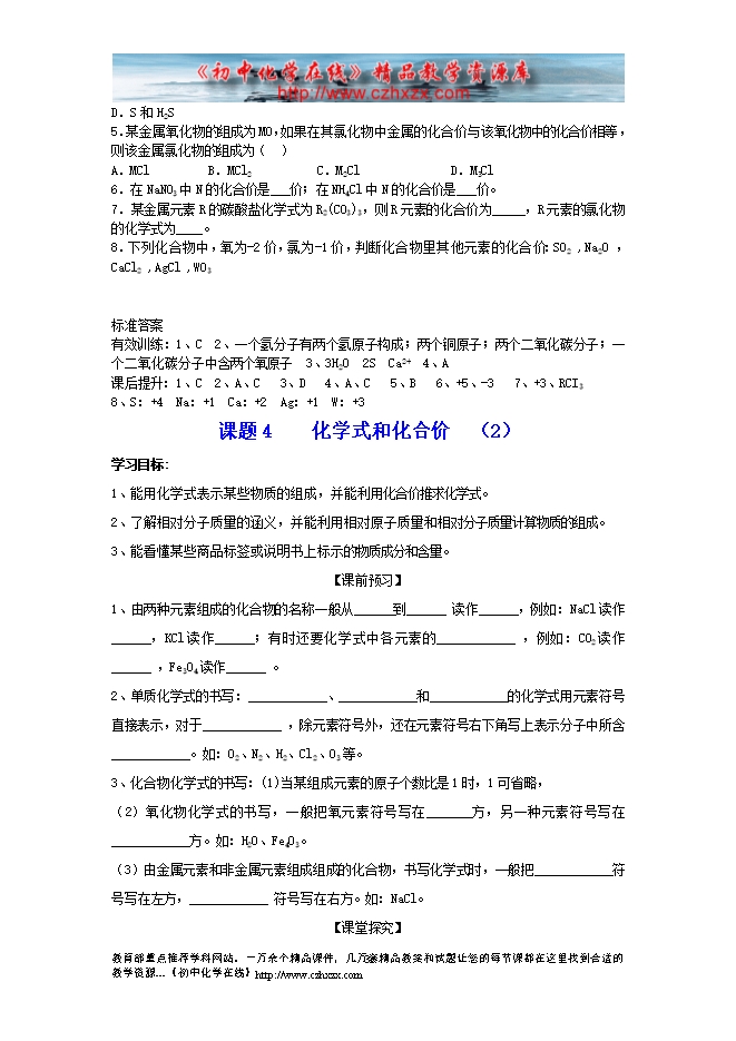 人教版《第四单元课题4 化学式和化合价》学案(一)